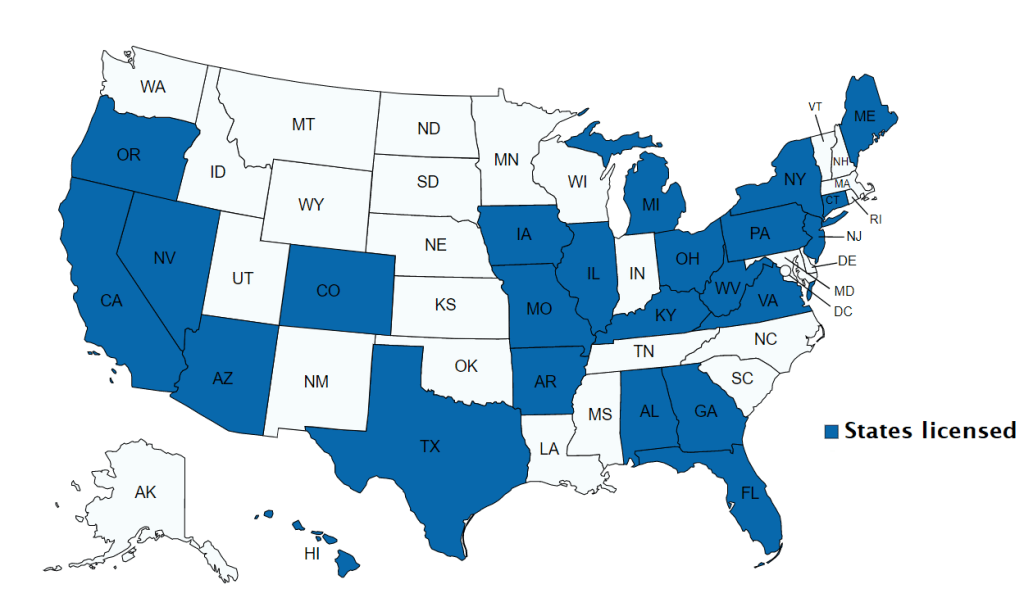 AL, AR, AZ, CA, CO, CT, FL, GA, HI, IA, IL, KY, ME, MI, MO, NJ, NV, NY, OH, OR, PA, TX, VA, WV